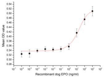 Erythropoietin (EPO) is a growth factor produced in the kidneys that stimulates the production of red blood cells. It works by promoting the division and differentiation of committed erythroid progenitors in the bone marrow. Epo additionally plays a tissue protective role in ischemia by blocking apoptosis and inducing angiogenesis. To test the effect of EPO on cell proliferation, TF-1 cells were seeded into triplicate wells of 96-well plates at a density of 8,000 cells/well with 2% serum standard 1640 which contains various concentrations of recombinant dog EPO. After incubated for 48h, cells were observed by inverted microscope and cell proliferation was measured by Cell Counting Kit-8 (CCK-8). Briefly, 10 µl of CCK-8 solution was added to each well of the plate, then the absorbance at 450 nm was measured using a microplate reader after incubating the plate for 4 hours at 37°C. Proliferation of TF-1 cells after incubation with EPO for 48h observed by inverted microscope was shown. Cell viability was assessed by CCK-8 assay after incubation with recombinant dog EPO for 48h. EPO significantly increased cell viability of TF-1 cells. The ED50 is 17 ng/ml. |