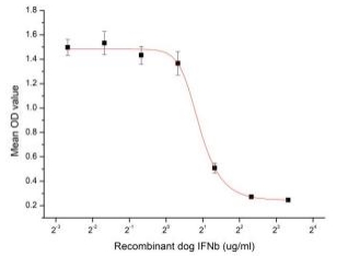 Interferon Beta (IFNb) is belongs to type I interferons (IFNs) family which a large subgroup of interferon proteins that help regulate the activity of the immune system.The IFNb proteins are produced in large quantities by fibroblasts. They have antiviral activity that is involved mainly in innate immune response. Two types of IFNb have been described, IFNb1 (IFNB1) and IFNb3 (IFNB3). IFNb1 is used as a treatment for multiple sclerosis as it reduces the relapse rate. To test the effect of IFNb on cell apoptosis, A549 cells were seeded into triplicate wells of 96-well plates at a density of 4,000 cells/well and allowed to attach overnight, then the medium was replaced with various concentrations of recombinant dog IFNb diluted with 5% serum standard DMEM. After incubated for 72h, cells were observed by inverted microscope and cell proliferation was measured by Cell Counting Kit-8 (CCK-8). Briefly, 10 µl of CCK-8 solution was added to each well of the plate, then the absorbance at 450 nm was measured using a microplate reader after incubating the plate for 1-4 hours at 37°C. Apoptosis of A549 cells after incubation with IFNb for 72h observed by inverted microscope was shown. Cell viability was assessed by CCK-8 (Cell Counting Kit-8 ) assay after incubation with recombinant dog IFNb for 72h. It was obvious that IFNb significantly decreased cell viability of A549 cells. The EC50 of recombinant dog IFNb is 1.86 μg/ml. |