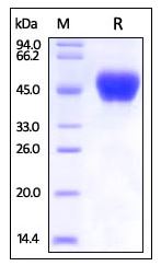 Molecular Mass : | The protein has a calculated MW of 34.3 kDa. The protein migrates as 40-55 kDa under reducing (R) condition (SDS-PAGE). |