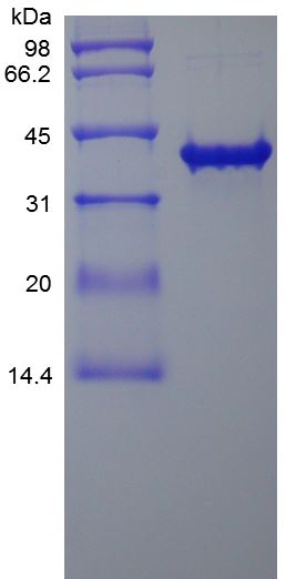Sox2, also named SRY (sex determining region Y)-box 2, is belonging to the Sox family and it is encoded by the Sox gene in human. This protein family shares highly conserved DNA binding domains known as HMG (High-mobility group) box domains containing approximately 80 amino acids. Sox2 plays a role in maintenance of embryonic and neural stem cells and holds great promise in research involving induced pluripotency, an emerging and very promising field of regenerative medicine. Mature human Sox2 shares 100 amino acid sequence identity with murine and rat Sox2. Recombinant human Sox2-TAT expressed in E. coli is a 36 kDa protein containing 330 amino-acid residues, including the 317 residues of full-length Sox2 and a 13-residue C-terminal TAT peptide (GGYGRKKRRQRRR). |