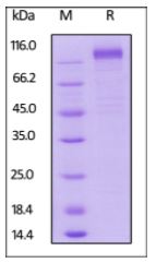 | Molecular Mass : | The protein has a calculated MW of 93.7 kDa. The protein migrates as 116-130 kDa under reducing (R) condition (SDS-PAGE) due to glycosylation. |