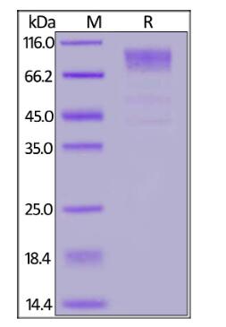 | Molecular Mass : | The protein has a calculated MW of 58.8 kDa. The protein migrates as 70-110 kDa under reducing (R) condition (SDS-PAGE) due to Glycosylation. |