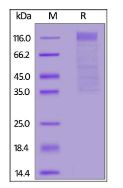 | Molecular Mass : | The protein has a calculated MW of 85.7 kDa. The protein migrates as 110-130 kDa under reducing (R) condition (SDS-PAGE) due to Glycosylation. |