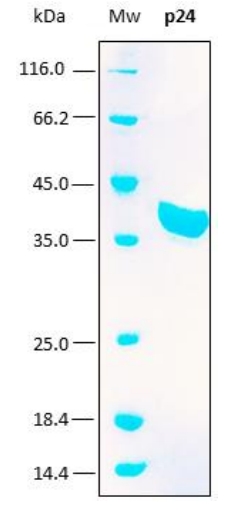 | Reference : | 1. Sundqvist VA, Albert J, Ohlsson E, Hinkula J, Fenyö EM, Wahren B. Human immunodeficiency virus type 1 p24 production and antigenic variation in tissue culture of isolates with various growth characteristics. 1989, J Med Virol, 29(3):170-5. 2. Gill SC, von Hippel PH. Calculation of protein extinction coefficients from amino acid sequence data. Anal Biochem. 1989 Nov 1;182(2):319-26. |