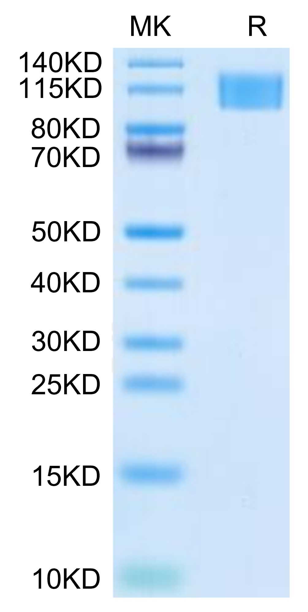 Molecular Mass : | The protein has a predicted MW of 78.86 kDa. Due to glycosylation, the protein migrates to 90-130 kDa based on Tris-Bis PAGE result. |