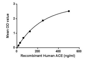Angiotensin-converting enzyme ACE, is a central component of the renin-angiotensin system (RAS), which controls blood pressure by regulating the volume of fluids in the body. It converts the hormone angiotensin I to the active vasoconstrictor angiotensin II. Therefore, ACE indirectly increases blood pressure by causing blood vessels to constrict. ACE inhibitors are widely used as pharmaceutical drugs for treatment of cardiovascular diseases. Besides, Actin Beta (ACTb) has been identified as an interactor of ACE, thus a binding ELISA assay was conducted to detect the interaction of recombinant human ACE and recombinant human ACTb. Briefly, ACE were diluted serially in PBS with 0.01% BSA (pH 7.4). Duplicate samples of 100μL were then transferred to ACTb-coated microtiter wells and incubated for 2h at 37°C. Wells were washed with PBST and incubated for 1h with anti-ACE pAb, then aspirated and washed 3 times. After incubation with HRP labelled secondary antibody, wells were aspirated and washed 3 times. With the addition of substrate solution, wells were incubated 15-25 minutes at 37°C. Finally, add 50µL stop solution to the wells and read at 450nm immediately. The binding activity of ACE and ACTb was in a dose dependent manner. |
