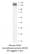 The protein encoded by this gene belongs to the angiotensin-converting enzyme family of dipeptidyl carboxydipeptidases and has considerable homology to human angiotensin 1 converting enzyme. This secreted protein catalyzes the cleavage of angiotensin I into angiotensin 1-9, and angiotensin II into the vasodilator angiotensin 1-7. The organ- and cell-specific expression of this gene suggests that it may play a role in the regulation of cardiovascular and renal function, as well as fertility. In addition, the encoded protein is a functional receptor for the spike glycoprotein of the human coronaviruses SARS and HCoV-NL63. [provided by RefSeq, Jul 2008] |