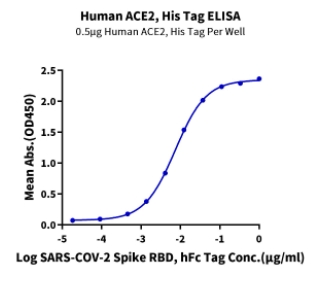 | Bio-activity : | Immobilized Human ACE2, His Tag at 5μg/ml (100μl/well) on the plate. Dose response curve for SARS-COV-2 Spike RBD, hFc Tag with the EC50 of 7.4ng/ml determined by ELISA. |