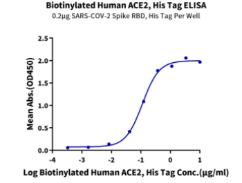 | Bio-activity : | Immobilized SARS-COV-2 Spike RBD, His Tag at 2ug/ml (100ul/well) on the plate. Dose response curve for Biotinylated Human ACE2, His Tag with the EC50 of 0.11ug/ml determined by ELISA. |