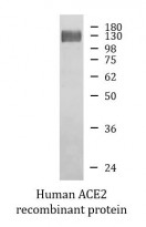 The protein encoded by this gene belongs to the angiotensin-converting enzyme family of dipeptidyl carboxydipeptidases and has considerable homology to human angiotensin 1 converting enzyme. This secreted protein catalyzes the cleavage of angiotensin I into angiotensin 1-9, and angiotensin II into the vasodilator angiotensin 1-7. The organ- and cell-specific expression of this gene suggests that it may play a role in the regulation of cardiovascular and renal function, as well as fertility. In addition, the encoded protein is a functional receptor for the spike glycoprotein of the human coronaviruses SARS and HCoV-NL63. [provided by RefSeq, Jul 2008] |