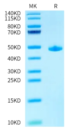 Molecular Mass : | The protein has a predicted MW of 37.43 kDa. Due to glycosylation, the protein migrates to 45-55 kDa based on Bis-Tris PAGE result. |