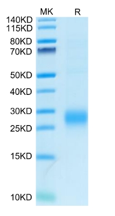 Molecular Mass : | The protein has a predicted MW of 11.5 kDa. Due to glycosylation, the protein migrates to 25-30 kDa based on Tris-Bis PAGE result. |