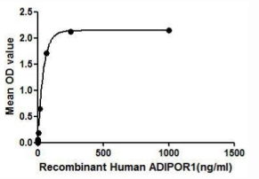 ADIPOR1 (Adiponectin receptor protein 1) is a receptor for ADP (30kDa adipocyte complement-related protein), an essential hormone secreted by adipocytes that regulates glucose and lipid metabolism. ADIPOQ-binding activates a signaling cascade that leads to increased AMPK activity, and ultimately to increased fatty acid oxidation, increased glucose uptake and decreased gluconeogenesis. Besides, human ADP and rat ADP exist similarities in amino acid sequence with the identity of 83.2%. Thus a binding ELISA assay was conducted to detect the interaction of recombinant human ADIPOR1 and recombinant rat ADP. Briefly, ADIPOR1 were diluted serially in PBS, with 0.01%BSA (pH 7.4). Duplicate samples of 100uL were then transferred to ADP-coated microtiter wells and incubated for 2h at 37°C. Wells were washed with PBST and incubated for 1h with anti-ADIPOR1 pAb, then aspirated and washed 3 times. After incubation with HRP labelled secondary antibody, wells were aspirated and washed 3 times. With the addition of substrate solution, wells were incubated 15-25 minutes at 37°C. Finally, add 50µL stop solution to the wells and read at 450nm immediately. The binding activity of of ADIPOR1 and ADP was shown, and this effect was in a dose dependent manner. |
