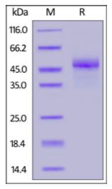 Molecular Mass : | The protein has a calculated MW of 38.2 kDa. The protein migrates as 55-60 kDa under reducing (R) condition (SDS-PAGE) due to glycosylation. |