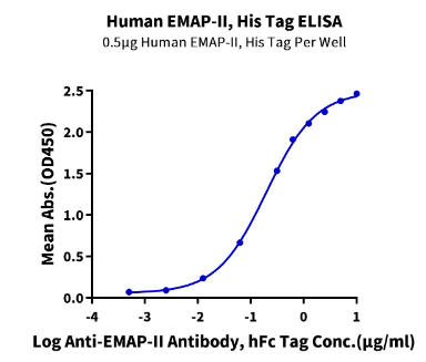 | Bio-activity : | Immobilized Human EMAP-II, His Tag at 5μg/ml (100μl/well) on the plate. Dose response curve for Anti-EMAP-II Antibody, hFc Tag with the EC50 of 0.20ug/ml determined by ELISA. |