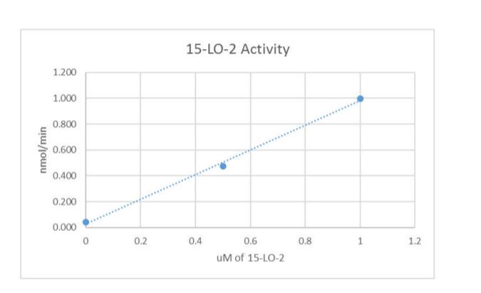 | Unit Definition : | One unit is defined as the amount of enzyme required to produce 1 nmol of 15-HpETE per min at 30 centigrade in 50 mM Tris-HCl, pH 7.2, containing 0.003% Polysorbate 20, and 250 μM arachidonic acid. |