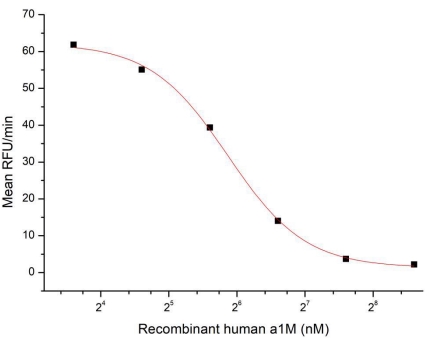 Alpha-1-Microglobulin (a1M) is a small protein belonging to the superfamily of lipocalins, which is present in various body fluids such as plasma and cerebrospinal fluid. it has a role in the transportation of molecules like metals and serves as a marker for certain diseases, including kidney and liver disorders.The activity of recombinant human A1M was measured by its ability to inhibit trypsin cleavage of a fluorogenic peptide substrate MCA-Arg-Pro-Lys-Pro-Val-Glu-NVAL-Trp-Arg-Lys(DNP)-NH2 in the assay buffer 50 mM Tris, 10 mM CaCl2, 150 mM NaCl, 0.05% (w/v) Brij-35, pH 7.5. Trypsin was diluted to 50 ug/ml in the assay buffer and 25 ul different concentrations of recombinant human a1M (MW: 64 KD) was incubated with 25ul diluted trypsin at 37°C for 15 minutes.Loading 50 µL of the incubated mixtures which were diluted five-fold in assay buffer into empty wells of a plate, and start the reaction by adding 50 µL of 20 µM substrate.nclude a substrate blank containing 50 µL of assay buffer and 50 µL of 20 µM substrate.Then read at excitiation and emission wavelengths of 320 nm and 405 nm, respectively, in kinetic mode for 5 minutes.The result was shown and it was obvious that recombinant human a1M significantly decreased trypsin activity. The inhibition IC50 was <58 nM. |
