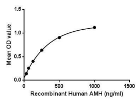 | Bio-activity : | Anti-Müllerian hormone (AMH), also named Müllerian inhibiting substance (MIS) belongs to a tissue-specific TGF-beta superfamily growth factor. It can be expressed by male sertoli cells and postnatal testis, and ovarian granulosa cells of females postpartum. AMH expression is critical to sex differentiation at a specific time during fetal development, it appears to be tightly regulated by SF1, GATA factors, DAX1 and FSH. AMH signals through a characteristic receptor consisting of a type I and a type II receptor serine/threonine kinase. Especially the type II receptor is unique and specific receptor for AMH. Besides, Mothers Against Decapentaplegic Homolog 9 (Smad9) has been identified as an interactor of AMH, thus a binding ELISA assay was conducted to detect the interaction of recombinant human AMH and recombinant human (Smad9) Briefly, AMH were diluted serially in PBS, with 0.01% BSA (pH 7.4). Duplicate samples of 100uL were then transferred to Smad9-coated microtiter wells and incubated for 2h at 37°C. Wells were washed with PBST and incubated for 1h with anti-AMH pAb, then aspirated and washed 3 times. After incubation with HRP labelled secondary antibody, wells were aspirated and washed 3 times. With the addition of substrate solution, wells were incubated 15-25 minutes at 37°C. Finally, add 50µL stop solution to the wells and read at 450nm immediately. The binding activity of of AMH and Smad9 was shown, and this effect was in a dose dependent manner. |