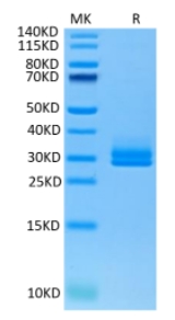 Molecular Mass : | The protein has a predicted MW of 30.1 kDa. Due to glycosylation, the protein migrates to 31-35 kDa based on Tris-Bis PAGE result. |