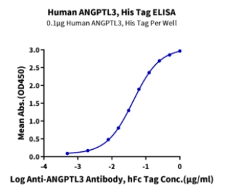| Bio-activity : | Immobilized Human ANGPTL3, His Tag at 1 μg/ml (100μl/Well). Dose response curve for Anti-ANGPTL3 Antibody, hFc Tag with the EC50 of 42.3ng/ml determined by ELISA. |