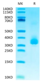 Molecular Mass : | The protein has a predicted MW of 26.6 kDa. Due to glycosylation, the protein migrates to 30-38 kDa based on Tris-Bis PAGE result. |