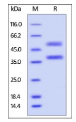 Molecular Mass : | The protein has a calculated MW of 39.0 kDa. The protein migrates as 38-40 kDa and 50-55 kDa under reducing (R) condition (SDS-PAGE) due to glycosylation. |
