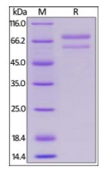 Molecular Mass : | The protein has a calculated MW of 64.1 kDa. The protein migrates as 60 kDa and 76 kDa under reducing (R) condition (SDS-PAGE) due to glycosylation. |