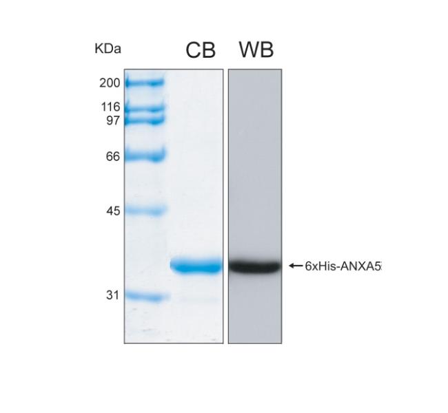 The Annexin 5 gene spans 29 kb containing 13 exons, and encodes a single transcript of approximately 1.6 kb and a protein product with a molecular weight of about 35 kDa.The protein encoded by this gene belongs to the annexin family of calcium-dependent phospholipid binding proteins some of which have been implicated in membrane-related events along exocytotic and endocytotic pathways. Annexin 5 is a phospholipase A2 and protein kinase C inhibitory protein with calcium channel activity and a potential role in cellular signal transduction, inflammation, growth and differentiation. Annexin 5 has also been described as placental anticoagulant protein I, vascular anticoagulant-alpha, endonexin II, lipocortin V, placental protein 4 and anchorin CII. Polymorphisms in this gene have been implicated in various obstetric complications. |