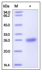 | Molecular Mass : | The protein has a calculated MW of 24 kDa. The protein migrates as 26 kDa under reducing (R) condition (SDS-PAGE) due to glycosylation. |