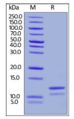 Molecular Mass : | The protein has a calculated MW of 11.2 kDa. The protein migrates as 11 kDa and 13 kDa under reducing (R) condition (SDS-PAGE) due to glycosylation. |