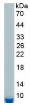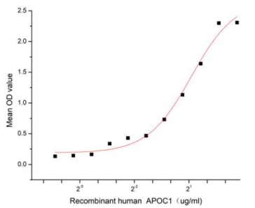 Apolipoprotein C1 (APOC1), also known as Apo-CI; Ap°C-I; apo-CIB; ap°C-IB, is the smallest size apolipoprotein of all apolipoprotein C family (Mr = 6.6 kDa) and located at position 19q13.32. APOC1 is primarily expressed in the liver and activated when monocytes differentiate into macrophages. It plays important roles in the innate immune response as effector of glucocorticoid-mediated responses and regulator of the inflammatory process. It has anti-inflammatory activity and also can promote the differentiation of T-cells into Th1 cells and negatively regulates differentiation into Th2 cells. Besides, Apolipoprotein C3 (APOC3) has been identified as an interactor of APOC1, thus a functional binding ELISA assay was conducted to detect the interaction of recombinant human APOC1 and recombinant mouse APOC3. Briefly, APOC1 was diluted serially in PBS with 0.01% BSA (pH 7.4). Duplicate samples of 100 μl were then transferred to APOC3-coated microtiter wells and incubated for 1h at 37°C. Wells were washed with PBST and incubated for 1h with anti-APOC1 pAb, then aspirated and washed 3 times. After incubation with HRP labelled secondary antibody for 1h at 37°C, wells were aspirated and washed 5 times. With the addition of substrate solution, wells were incubated 15-25 minutes at 37°C. Finally, add 50 µL stop solution to the wells and read at 450/630 nm immediately. The binding activity of recombinant human APOC1 and recombinant mouse APOC3 was shown, the EC50 for this effect is 2.19 ug/mL. |