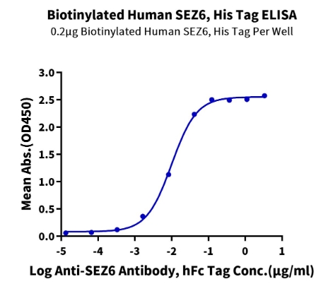 | Bio-activity : | Immobilized Biotinylated Human SEZ6, His Tag at 2μg/ml (100μl/well) on the streptavidin precoated plate (5μg/ml). Dose response curve for Anti-SEZ6 Antibody, hFc Tag with the EC50 of 10.0ng/ml determined by ELISA. |