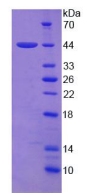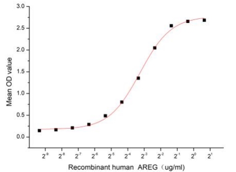 Amphiregulin (AREG) is a well-characterized member of the epidermal growth factor (EGF) family and is one of the ligands of the EGF receptor (EGFR). AREG plays a key role in mammalian development and in the control of branching morphogenesis in various organs. Furthermore, AREG participates in a wide range of physiological and pathological processes activating the major intracellular signalling cascades governing cell survival, proliferation and motility. Besides, EGF has been identified as an interactor of AREG, thus a functional binding ELISA assay was conducted to detect the interaction of recombinant human AREG and recombinant rat EGF. Briefly, AREG was diluted serially in PBS with 0.01% BSA (pH 7.4). Duplicate samples of 100 μl were then transferred to EGF-coated microtiter wells and incubated for 1h at 37°C. Wells were washed with PBST and incubated for 1h with anti-AREG pAb, then aspirated and washed 3 times. After incubation with HRP labelled secondary antibody for 1h at 37°C, wells were aspirated and washed 5 times. With the addition of substrate solution, wells were incubated 15-25 minutes at 37°C. Finally, add 50 µL stop solution to the wells and read at 450/630 nm immediately. The binding activity of recombinant human AREG and recombinant rat EGF was shown, the EC50 for this effect is 0.1 ug/mL. |