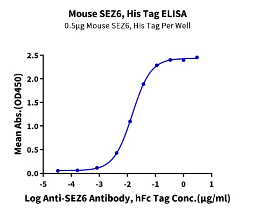 | Bio-activity : | Immobilized Mouse SEZ6, His Tag at 5μg/ml (100μl/well) on the plate. Dose response curve for Anti-SEZ6 Antibody, hFc Tag with the EC50 of 14.8ng/ml determined by ELISA. |