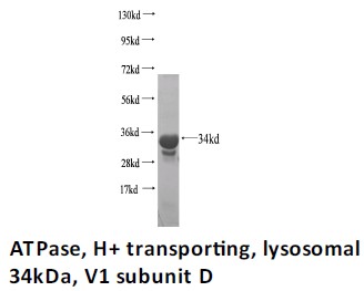 | Synonyms | ATP6V1D; ATPase, H+ transporting, lysosomal 34kDa, V1 subunit D; ATP6M, ATPase, H+ transporting, lysosomal (vacuolar proton pump); V-type proton ATPase subunit D; VATD; VMA8; V-ATPase D subunit; V-ATPase subunit D; vacuolar H-ATPase subunit D; vacuolar proton pump D subunit; vacuolar proton pump subunit D; vacuolar ATP synthase subunit D; vacuolar proton-ATPase subunit D; V-ATPase 28 kDa accessory protein; vacuolar proton pump delta polypeptide; ATPase, H+ transporting lysosomal, member M; H(+)-transporting two-sector ATPase, subunit M; ATPase, H+ transporting, lysosomal (vacuolar proton pump); ATP6M; |