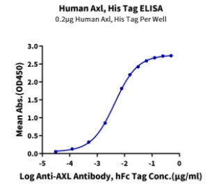 | Bio-activity : | Immobilized Human AXL, His Tag at 2ug/ml (100ul/well) on the plate. Dose response curve for Anti-AXL Antibody, hFc Tag with the EC50 of 4.4ng/ml determined by ELISA. |