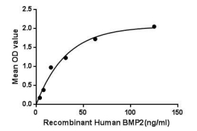 Bone morphogenetic protein 2 (BMP2) belongs to the TGF-β superfamily of proteins. It plays an important role in the development of bone andcartilage. BMP2 is involved in the hedgehog pathway, TGF beta signaling pathway, and in cytokine-cytokine receptor interaction. It also paticipated in cardiac cell differentiation and epithelial to mesenchymal transition. Like many other proteinsfrom the BMP family, BMP2 has been demonstrated to potently induce osteoblast differentiation in a variety of cell types. Besides, Follistatin Like Protein1(FSTL1)has been identified as an interactor of BMP2, thus a binding ELISA assay was conducted to detect the interaction of recombinant human BMP2 and recombinant human FSTL1. Briefly, BMP2 were diluted serially in PBS, with 0.01% BSA(pH7.4). Duplicate samples of 100µL were then transferred to FSTL1-coated microtiter wells and incubated for 2h at 37°C. Wells were washed with PBST and incubated for 1h with anti-BMP2 pAb, then aspirated and washed 3 times. After incubation with HRP labelled secondary antibody, wells were aspirated and washed 3 times. With the addition of substrate solution, wells were incubated 15-25 minutesat 37°C. Finally, add 50µL stop solution to the wells and read at 450 nmimmediately. The binding activity of BMP2 and FSTL1 wasin a dose dependent manner. |