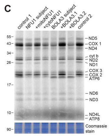 Fig1. Impaired mitochondrial protein synthesis in NFU1 and BOLA3 subject fibroblasts.