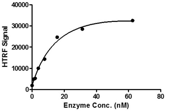| Bio-activity : | 3 μM histone H4K5/8/12/16(ac4) peptide was incubated with different concentrations of BRD2 (344-455), GST-tag protein in 10 μl reaction system containing 50 mM HEPES-NaOH pH 7.4, 0.1% BSA for 1 hour, then 10 μl GST antibody and SA-XL665 mixture (each 1:100 dilution in the reaction buffer) was added to each reaction system and incubated for 30 min. All the operations and reactions were performed at room temperature. HTRF assay was used for detection. |
