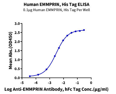 | Bio-activity : | Immobilized Human EMMPRIN, His Tag at 1μg/ml (100μl/well) on the plate. Dose response curve for Anti-EMMPRIN Antibody, hFc Tag with the EC50 of 3.0ng/ml determined by ELISA. |