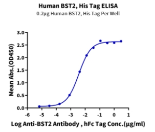 | Bio-activity : | Immobilized Human BST2, His Tag at 2ug/ml (100ul/Well) on the plate. Dose response curve for Anti-BST2 Antibody, hFc Tag with the EC50 of 3.6ng/ml determined by ELISA. |