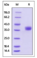 | Molecular Mass : | The protein has a calculated MW of 25.8 kDa. The protein migrates as 35-40 kDa under reducing (R) condition (SDS-PAGE) due to glycosylation. |