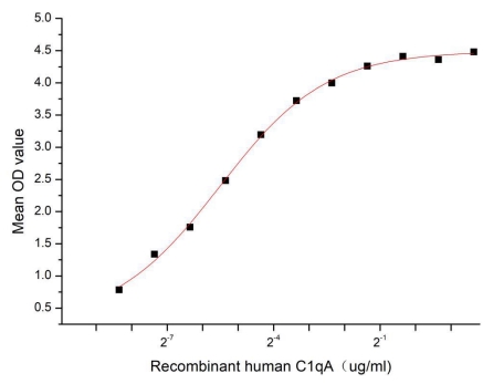 Complement Component 1, Q Subcomponent A (C1qA) is a subunit of the C1q complex in the complement system. It has a crucial role in recognizing pathogens and immune complexes. Structurally, it contributes to the overall architecture of C1q, enabling it to interact with various ligands. Functionally, it is essential for initiating the classical complement pathway.Binding of C1qA to C1r activates C1r, triggering the classical complement cascade for pathogen elimination and immune response regulation.Thus a functional ELISA assay was conducted to detect the interaction of recombinant human C1qA and recombinant mouse C1r. Briefly, C1qA was diluted serially in PBS with 0.01% BSA (pH 7.4). Duplicate samples of 100 μl were then transferred to C1r-coated microtiter wells and incubated for 1h at 37°C. Wells were washed with PBST and incubated for 1h with anti-C1qA pAb, then aspirated and washed 3 times. After incubation with HRP labelled secondary antibody for 1h at 37°C, wells were aspirated and washed 5 times. With the addition of substrate solution, wells were incubated 15-25 minutes at 37°C. Finally, add 50 µL stop solution to the wells and read at 450/630nm immediately. The binding activity of recombinant human C1qA and recombinant mouse C1r was shown, the EC50 for this effect is 0.022ug/mL. |