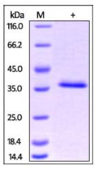 | Molecular Mass : | The protein has a calculated MW of 24.6 kDa. The protein migrates as 35 kDa under reducing (R) condition (SDS-PAGE). |