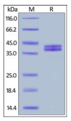 Molecular Mass : | The protein has a calculated MW of 34.6 kDa. The protein migrates as 38-40 kDa and 41-44 kDa under reducing (R) condition (SDS-PAGE) due to glycosylation. |