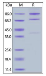| Molecular Mass : | The mature form of Complement C5 is a disulfide-linked heterodimer composed of proteolytically cleaved α and β chain. Each α and β chain has a calculated MW of 73.9 kDa (β chain) and 114.7 kDa (α chain). The protein migrates as 76 kDa (β chain) and 116 kDa (α chain) under reducing (R) condition (SDS-PAGE) due to glycosylation. |