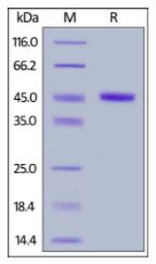 | Molecular Mass : | The protein has a calculated MW of 47.0 kDa. The protein migrates as 46 kDa under reducing (R) condition (SDS-PAGE) due to glycosylation. |