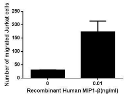 Macrophage inflammatory protein-1β (MIP-1β), also known as CCL4 is a CC chemokine with specificity for CCR5 receptors. It is a chemoattractant for natural killer cells, monocytes and a variety of other immune cells. MIP-1β is a kind of chemotactic cytokine. Thus, chemotaxis assay used 24-well microchemotaxis system was undertaken to detect the chemotactic effect of MIP-1β on the human T-lymphocyte leukemia cell line Jurkat. Briefly, Jurkat cells were seeded into the upper chambers (100uL cell suspension, 5×10^5 cells/mL in RPMI 1640 with FBS free) and recombinant human MIP-1β (0.0001ng/mL, 0.001ng/mL, 0.1ng/mL, 1ng/mL, 10ng/mL, 100ng/mL diluted separately in serum free RPMI 1640) was added in lower chamber with a polycarbonate filter (8um pore size) used to separate the two compartments. After incubation at 37°C with 5% CO2 for 2h, the filter was removed, then cells in low chamber were observed by inverted microscope at low magnification (×100) and the number of migrated cells were counted at high magnification (×200) randomly (five fields for each filter). Result shows recombinant human MIP-1β is able to induce migration of Jurkat cells. The migrated Jurkat cells in low chamber at low magnification (×100) were shown. Five fields of each chamber were randomly chosen, and the migrated cells were counted at high magnification (×200). Statistical results were shown. The optimum chemotaxis of MIP-1β occurs at 0.1~10pg/mL. |