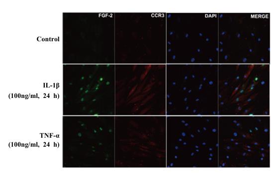 Fibroblast-like synoviocyte (FLS) invasion in synovium appears one of the features of OA, but expression and function of CCR3 on FLS remain uninvestigated. This study explored it. Enzymatically dispersed synovial tissue cells were analyzed by flowcytometry. Primary cultured FLS isolated from OA synovium were challenged and the expression of CCR3, eotaxin-1 and matrix metalloproteinase (MMP)-9 was determined by quantitative real-time PCR (qPCR) and ELISA. Approximately 4.5% dispersed OA synovial tissue cells are CCR3+ cells. Eotaxin-1 induced up to 5.8 and 7.2-fold increases in the expression of MMP-9 mRNA and protein, respectively following 12h incubation with FLS, which was inhibited by antagonist of CCR3 SB328437 and an inhibitor of ERK U0126, indicating that action of eotaxin-1 on FLS seemed via CCR3 and ERK signaling pathway.