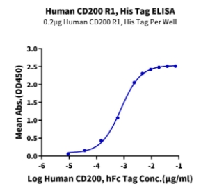 | Bio-activity : | Immobilized Human CD200 R1, His Tag at 2ug/ml (100ul/Well) on the plate. Dose response curve for Human CD200, hFc Tag with the EC50 of 0.77ng/ml determined by ELISA. |